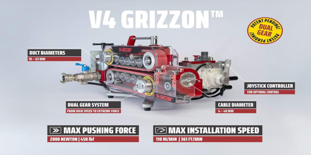 Pomimo lekkiej i kompaktowej konstrukcji (ok. 31 kg), V4 Grizzon została zaprojektowana z myślą o ciężkiej pracy. Łączy dwa silniki pneumatyczne z wytrzymałą anodowaną aluminiową ramą, generując siłę nacisku do 2000 N w trybie niskiego biegu i osiągając prędkość do 110 m/min na wysokim biegu. Dzięki temu jest to jedna z najmocniejszych i najsolidniejszych maszyn do wdmuchiwania kabli w swojej klasie — gotowa do codziennego, profesjonalnego użytku.